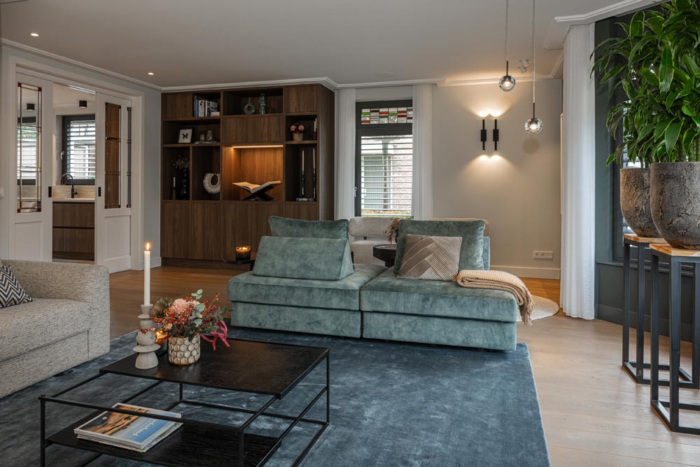 Met modulaire meubelstukken is flexibiliteit gecreëerd zonder in te leveren op stijl. De opstelling past zich moeiteloos aan het dagelijks leven aan en draagt bij aan de fijne, huiselijke sfeer die centraal staat in dit ontwerp.